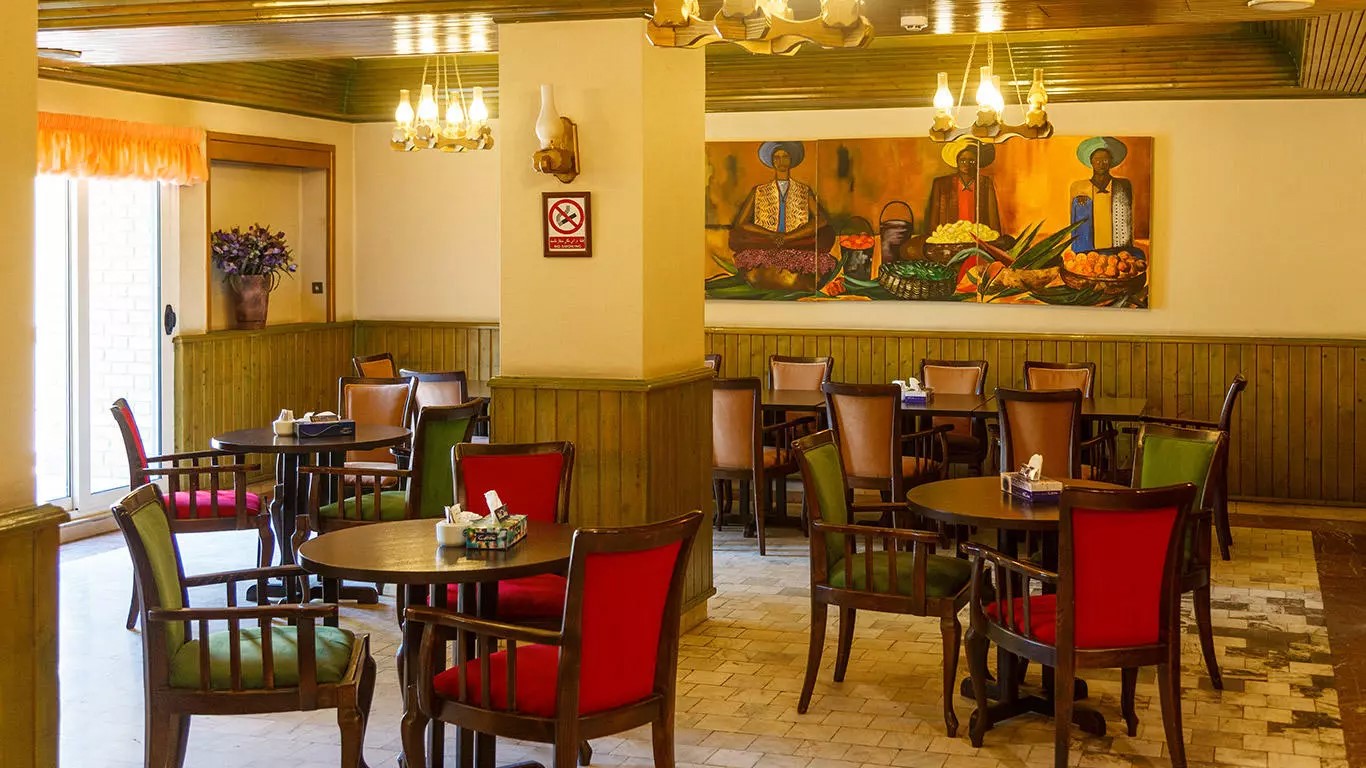 The Alborz Hotel café, with a capacity of 40 guests, operates 24 hours a day. It is perfect for private and business meetings. The café’s unique decor, featuring vintage cabinets and artistic wall decorations, creates a charming ambiance.