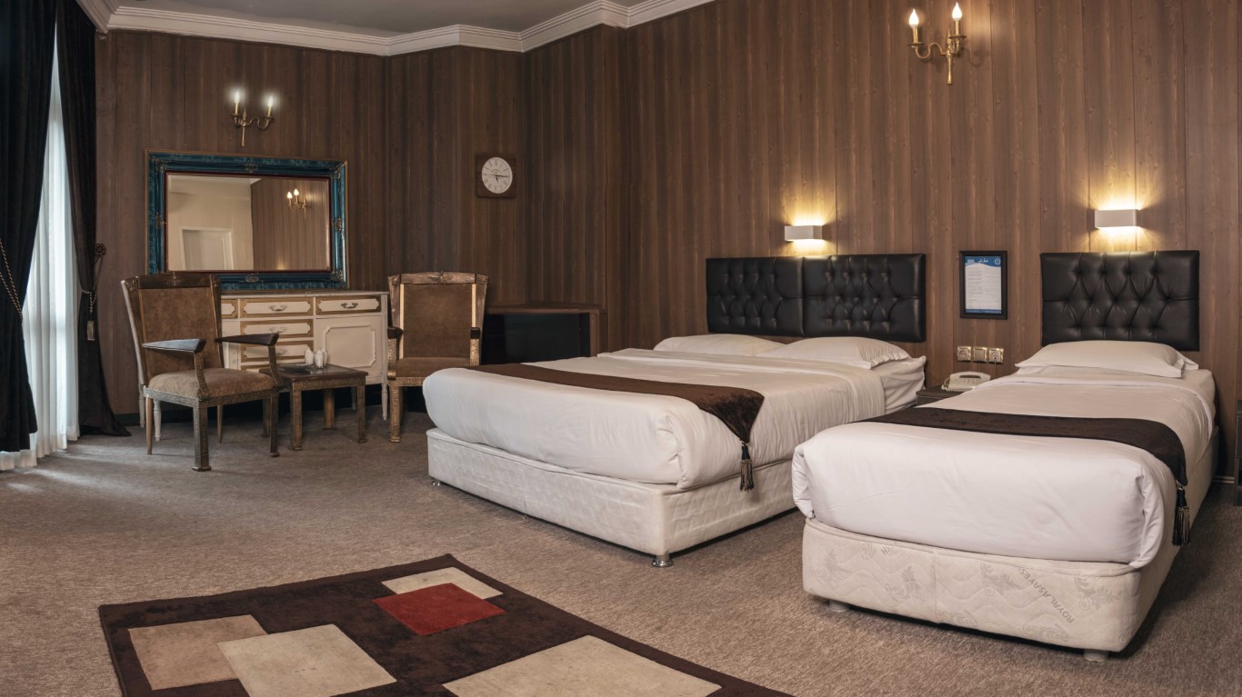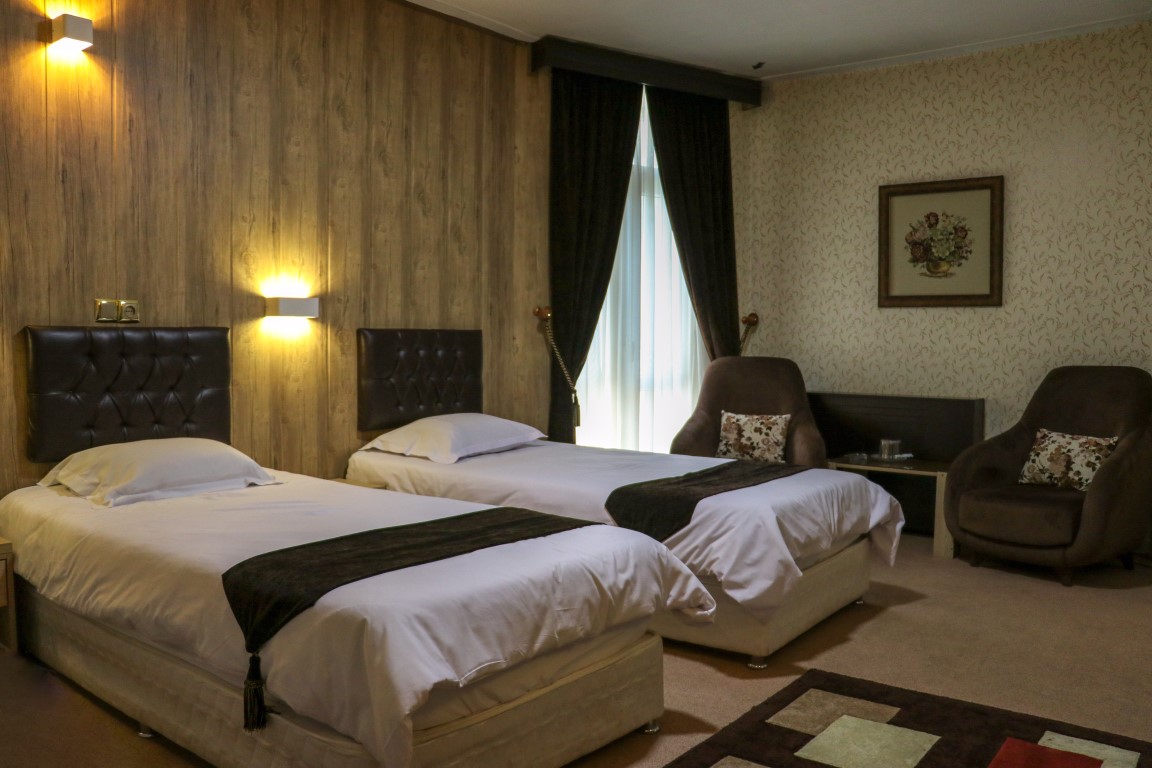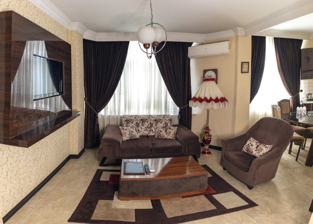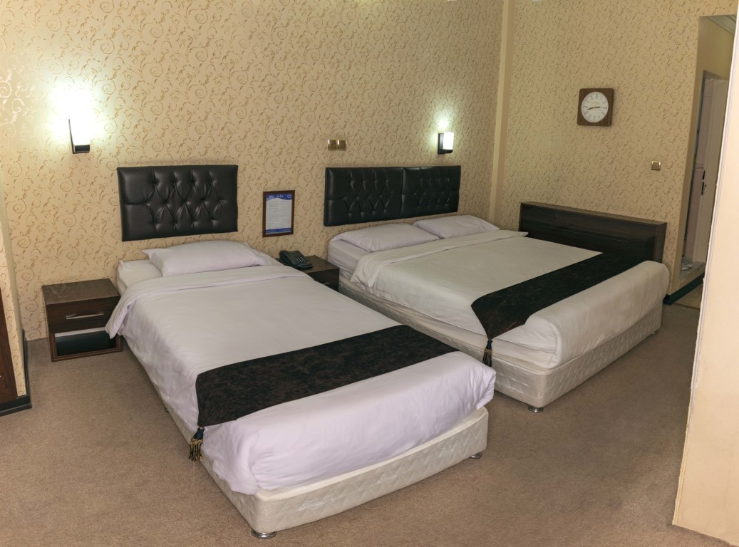 The rooms at Bolour Hotel Tehran are designed for comfort, featuring amenities like air conditioning, comfortable beds, televisions, dressing tables, and minibars. Each room has a private safe for valuables and a private bathroom with toiletries. Room options include twin rooms with two single beds, double rooms with one double bed, and triple rooms suitable for families or groups. For more space and additional amenities, the hotel offers triple suites with a separate living area and kitchen.