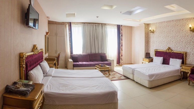 Gole Sorkh Hotel Mashhad offers three types of rooms: single, double, and triple. The standard rooms include breakfast, while the full-board rooms provide breakfast, lunch, and dinner. The four-bed rooms consist of two single beds and one double bed, while the three-bed rooms feature one single bed and one double bed. Reviews about Gole Sorkh Mashhad Hotel praise the experienced staff and the hotel`s facilities. Some rooms offer a view of the Imam Reza shrine. The hotel has a total of 90 beds, and complimentary parking is available on-site.