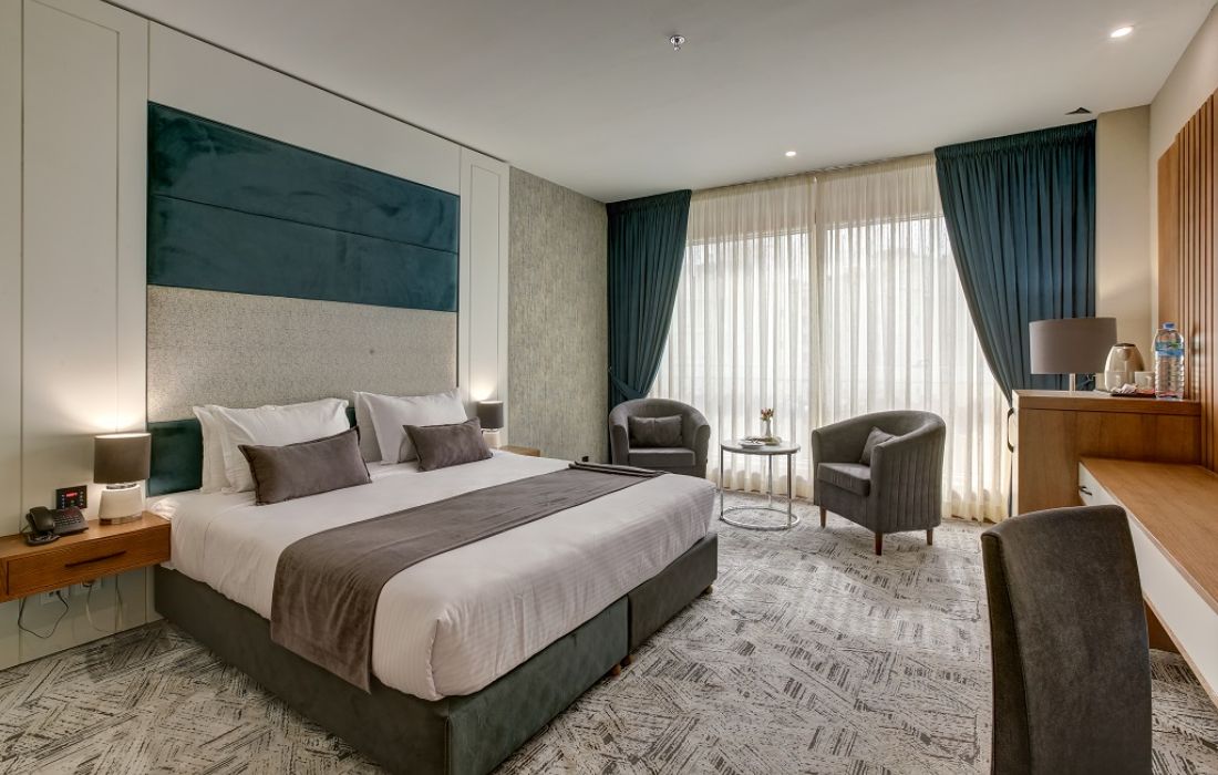 This five-star hotel features 3 restaurants with a total area of 2,400 square meters, a conference hall for meetings and events, a swimming pool, a hydrotherapy center, a fitness club, and luxury shops. Additional amenities include free internet, an internet café, green space, a coffee shop, laundry services, and special VIP services. You can book rooms at Khorshid Hashtom Hotel through SnappTrip at the best prices.