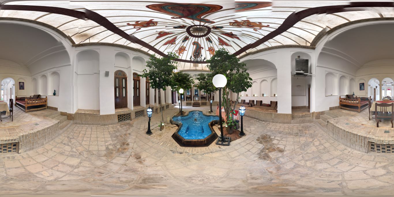 Upon entering the hotel, guests are greeted by a grand courtyard adorned with a beautiful garden and a central pool. The courtyard is a tranquil oasis, offering a serene atmosphere where guests can relax and enjoy the pleasant weather of Yazd. The surrounding walls are decorated with traditional Persian tiles, reflecting the region's rich artistic heritage.