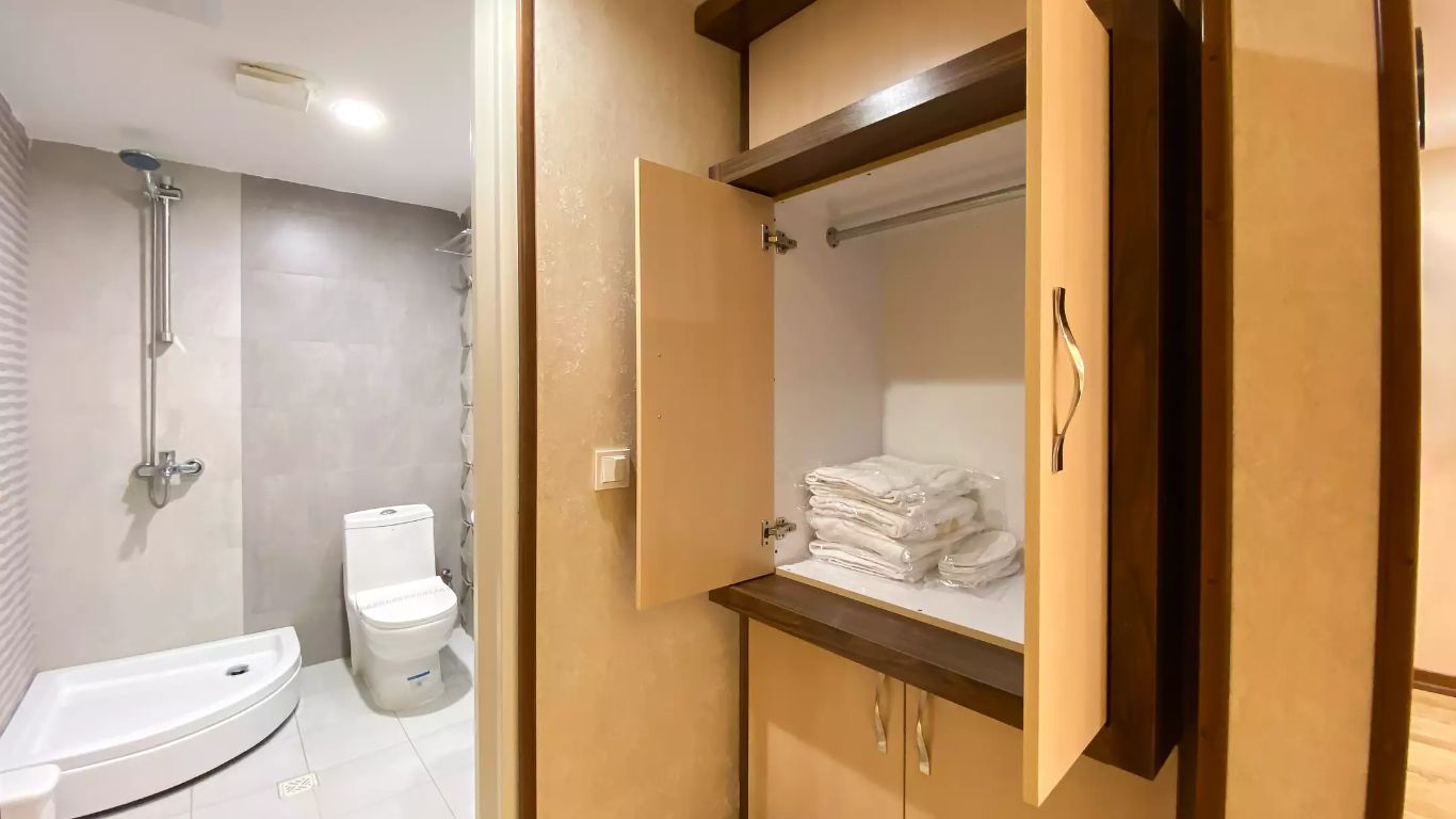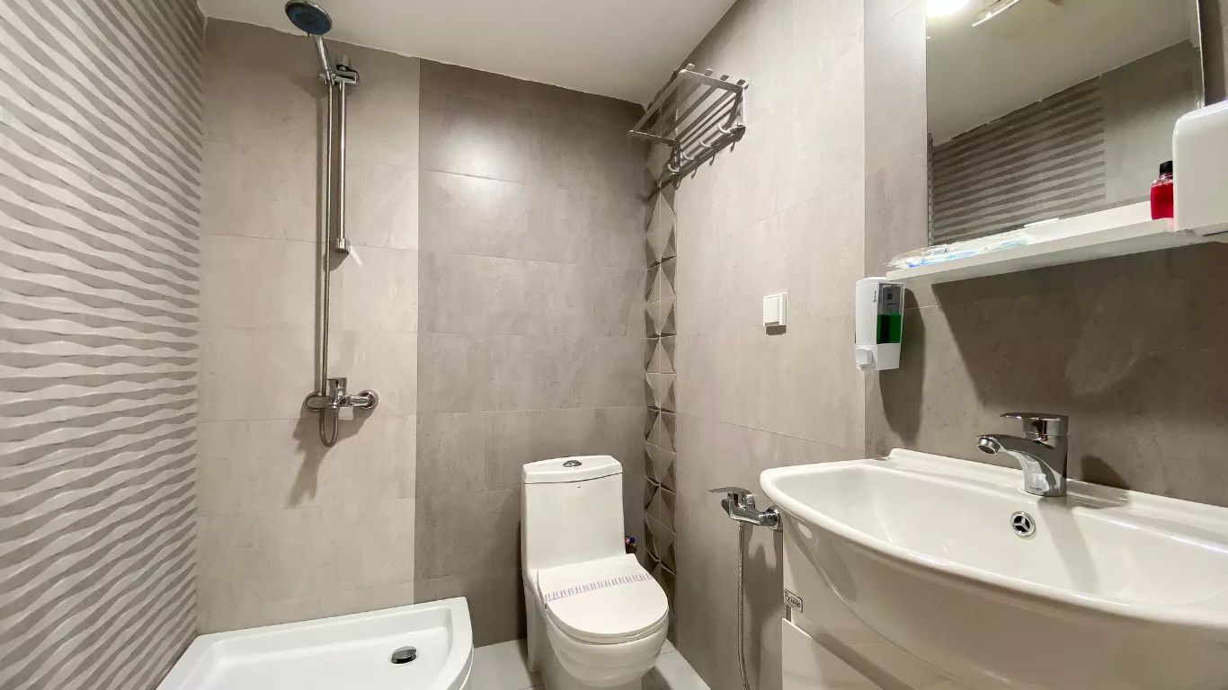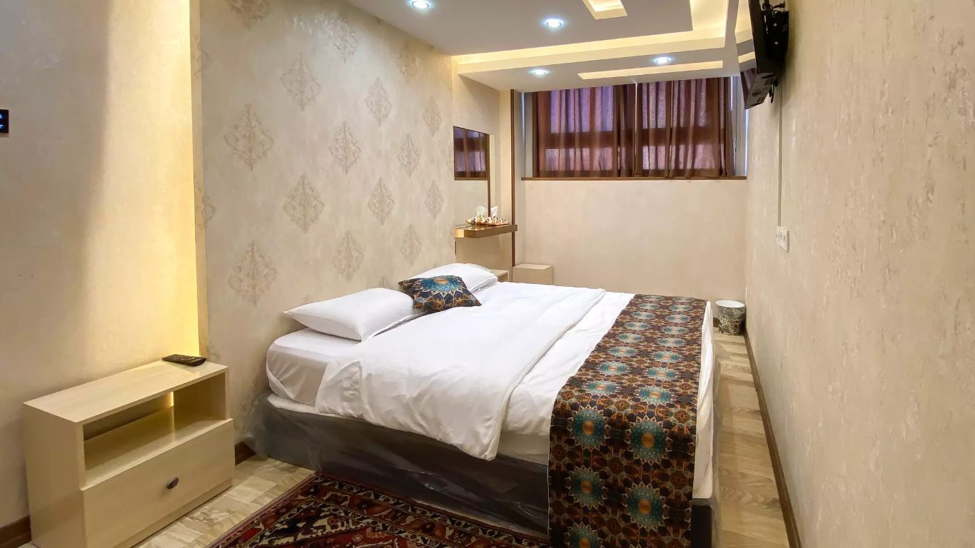 Each room overlooks the lively Ostandari Street, and all rooms are soundproofed with double-glazed windows and equipped with an air conditioning system to ensure a peaceful experience. Room amenities include a dining table, electric kettle, mini fridge, wardrobe, luggage storage, TV, and mirror. The decor features decorative lighting in the ceiling and traditional Persian carpets for a blend of modern and familiar ambiance. Rooms also come with private bathrooms and Western-style toilets.