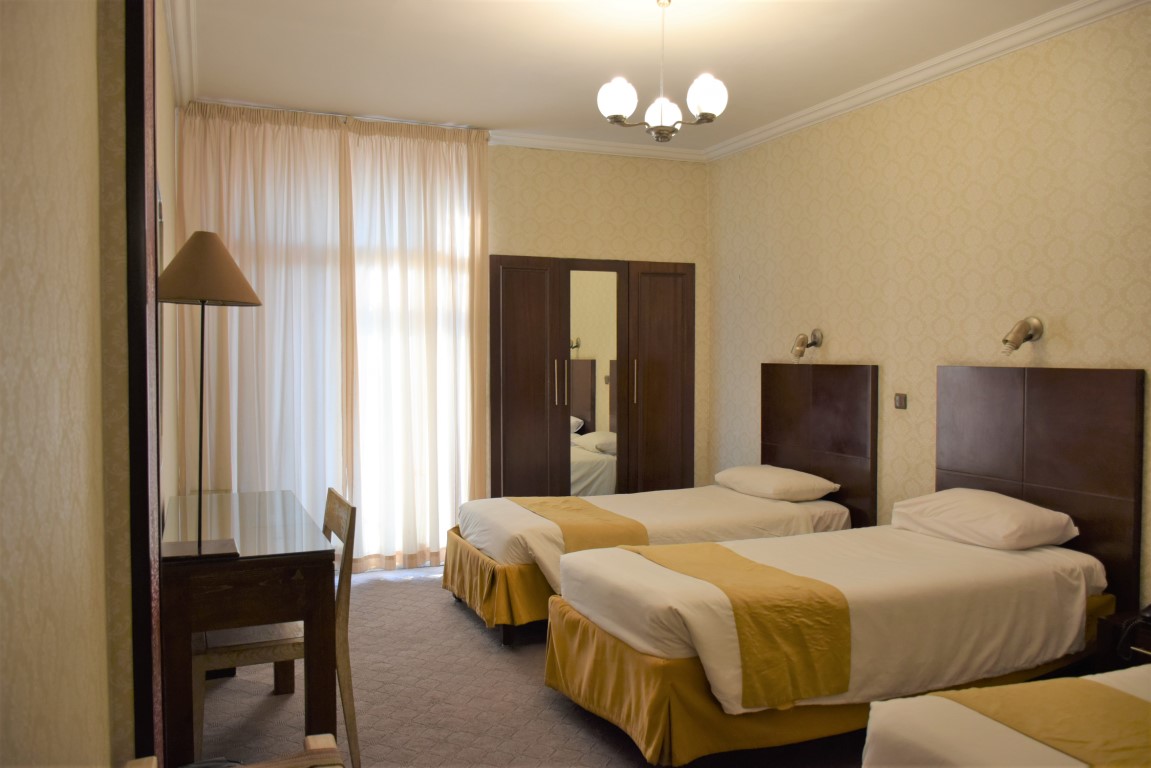Mashhad Hotel Tehran has 111 rooms with nearly 200 beds, offered as single, twin, double, and triple units measuring between 35 and 70 square meters. All rooms overlook the streets and are fitted with double-glazed soundproof windows, ensuring quiet stays. Extra beds can be arranged, and all bookings include complimentary breakfast. Please note that baby cribs are not available.