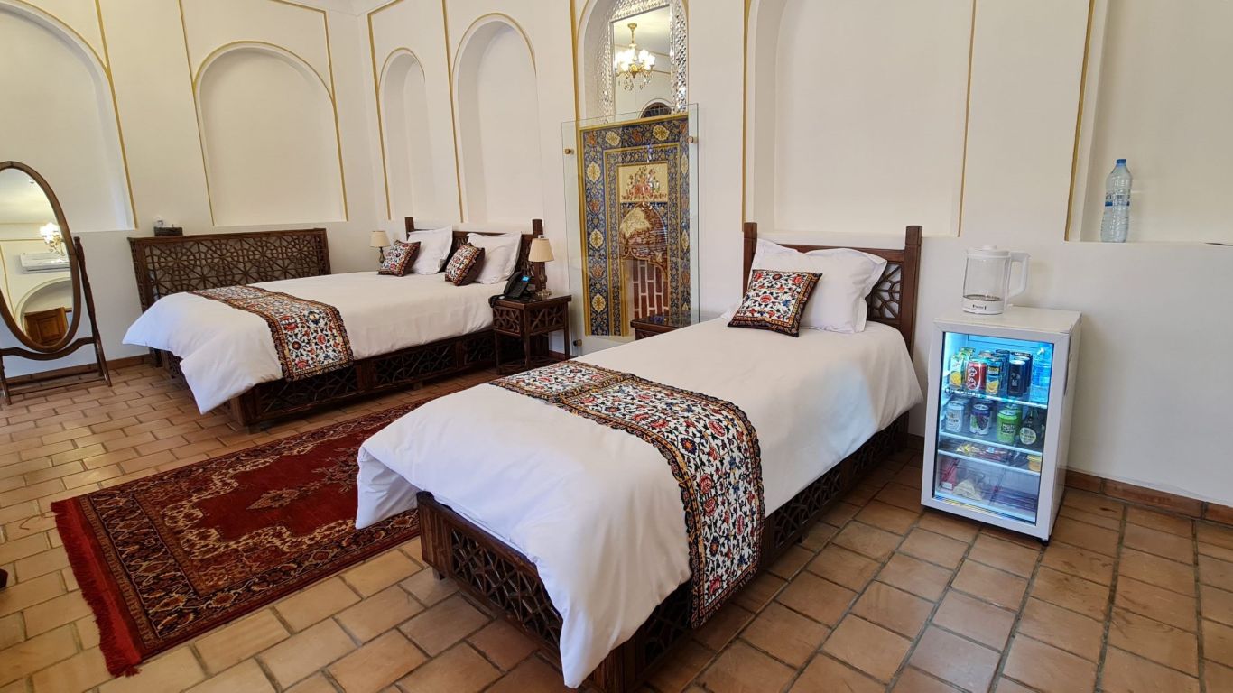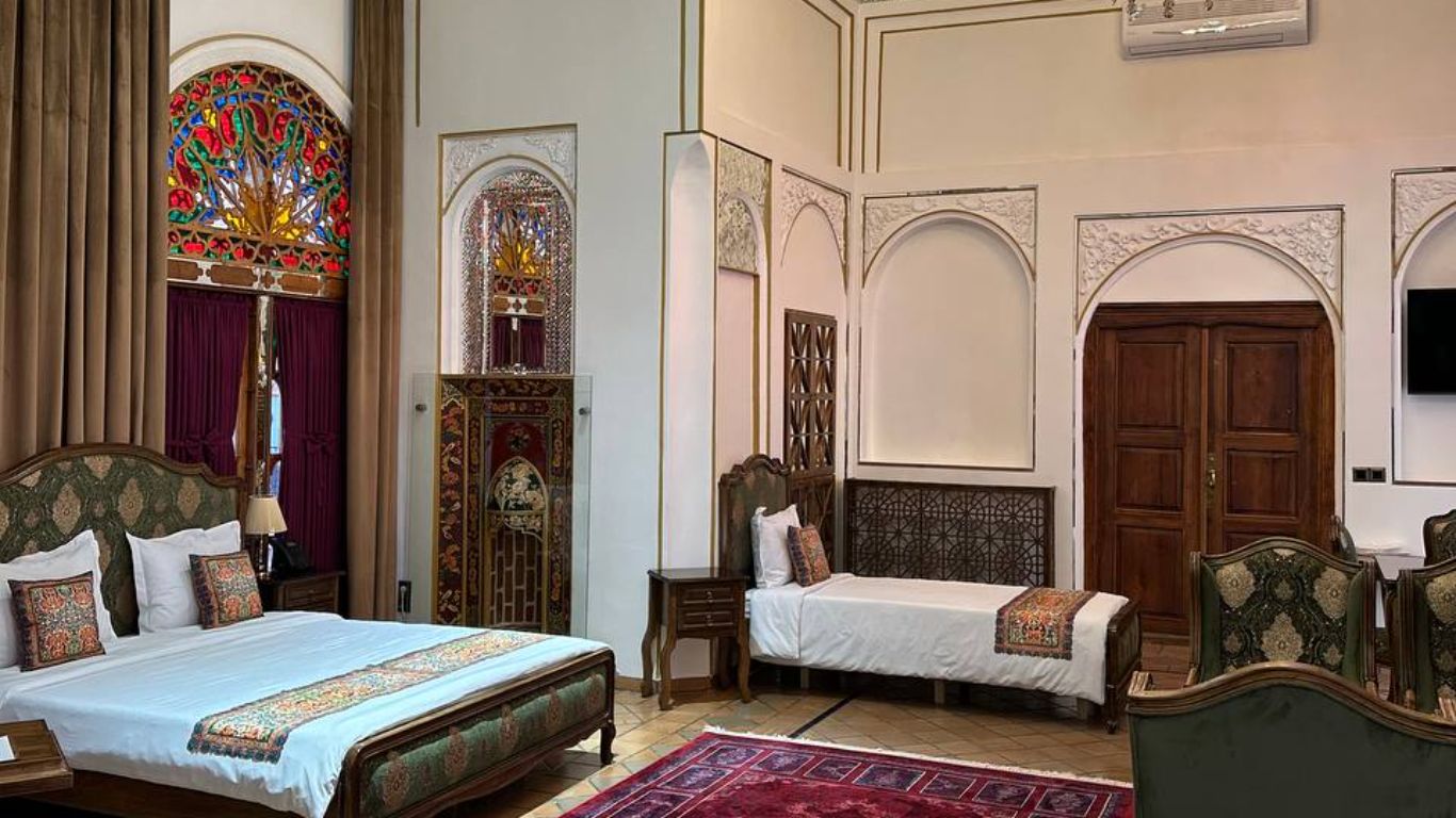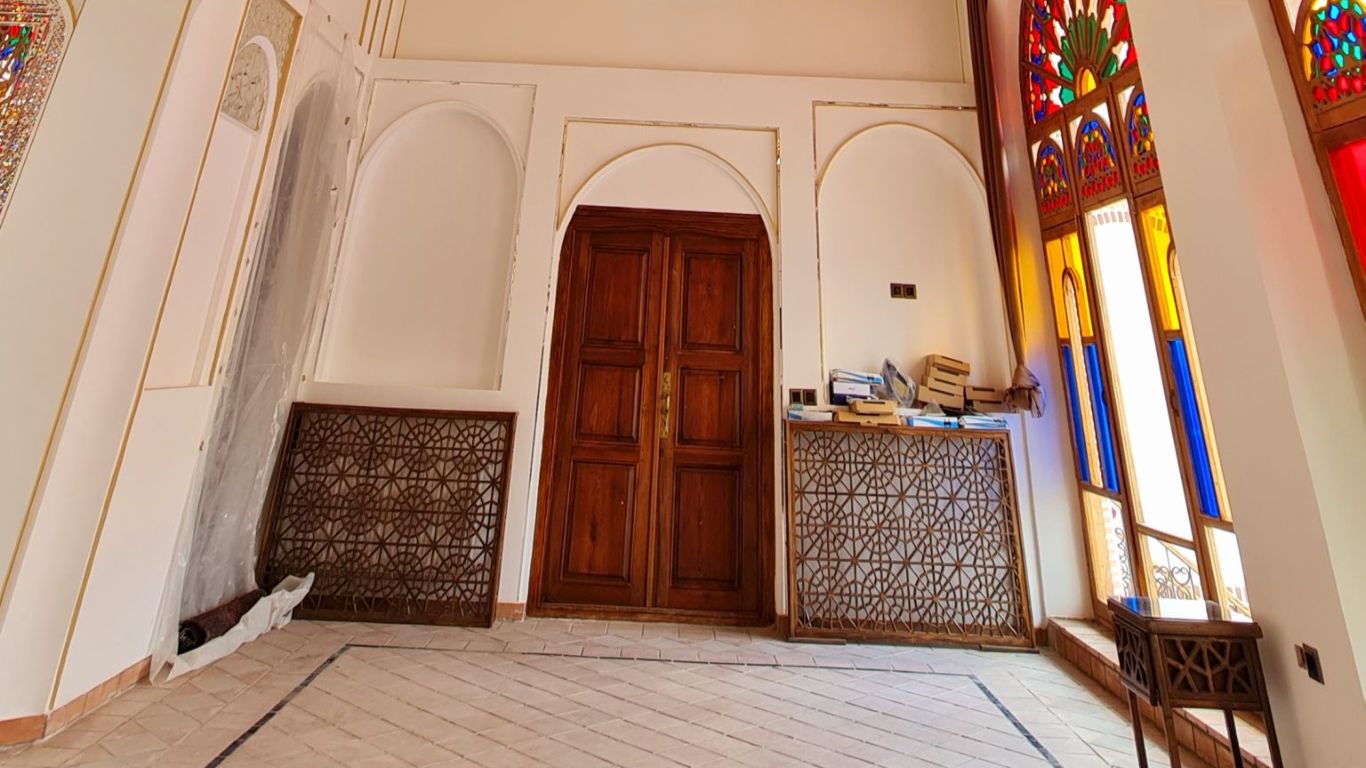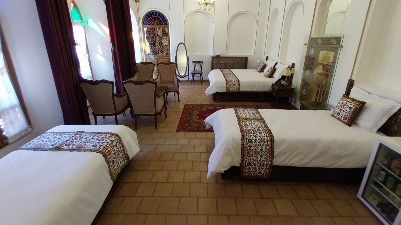The hotel has two floors and six rooms, all restored and outfitted with essential comforts. The building’s original layout remains intact, allowing guests to experience authentic residential architecture from the late Qajar period.