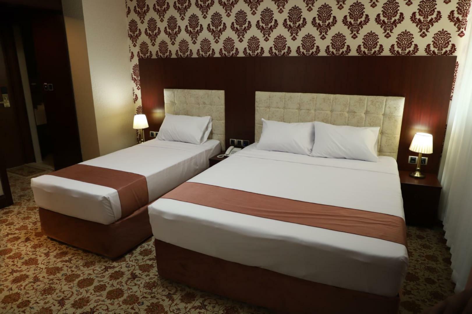 The hotel offers a variety of spacious rooms, including double and twin rooms, triple rooms, quadruple rooms, and two-bedroom suites. Room check-in is at 2:00 PM, and check-out is at 12:00 PM. Guests are advised to consider their arrival time in Mashhad when booking their tickets. Rooms are equipped with amenities such as refrigerators, furniture, closets, televisions, complimentary water, private bathrooms with toiletries, Iranian and Western-style toilets, heating and cooling systems, air conditioning, and minibars at an additional cost.