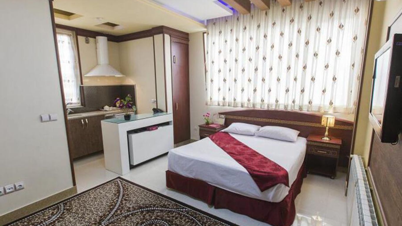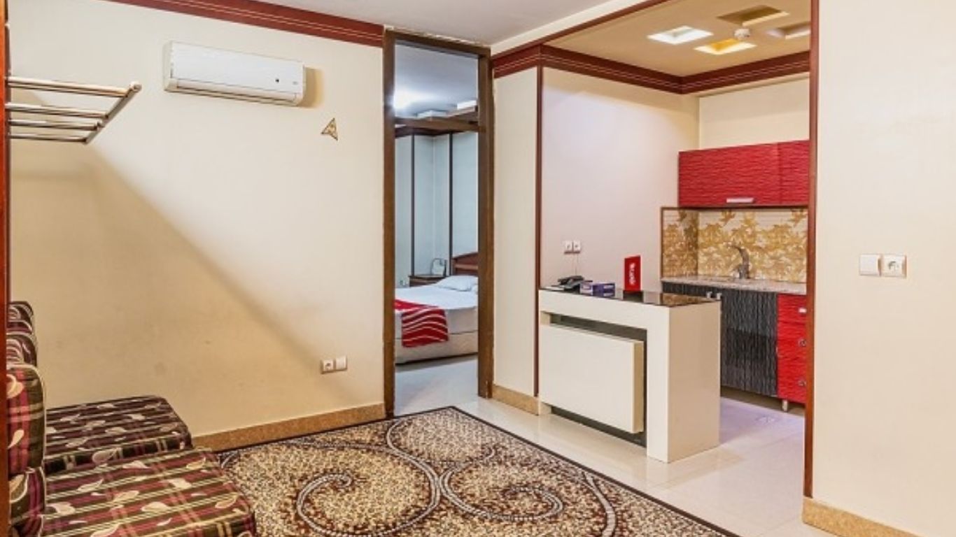 Rooms at Olia Hotel feature a small kitchenette equipped with a dishwasher, cabinets, and a refrigerator, albeit without cooking facilities. Additional amenities include a vanity table, toiletries, wardrobe, clothes rack, television, sofa set, and split air conditioning system. The spacious bathrooms include both Iranian and Western-style toilets and showers. Note that extra beds are unavailable in any room. Olia Hotel offers full-board room reservation services for added dining convenience.