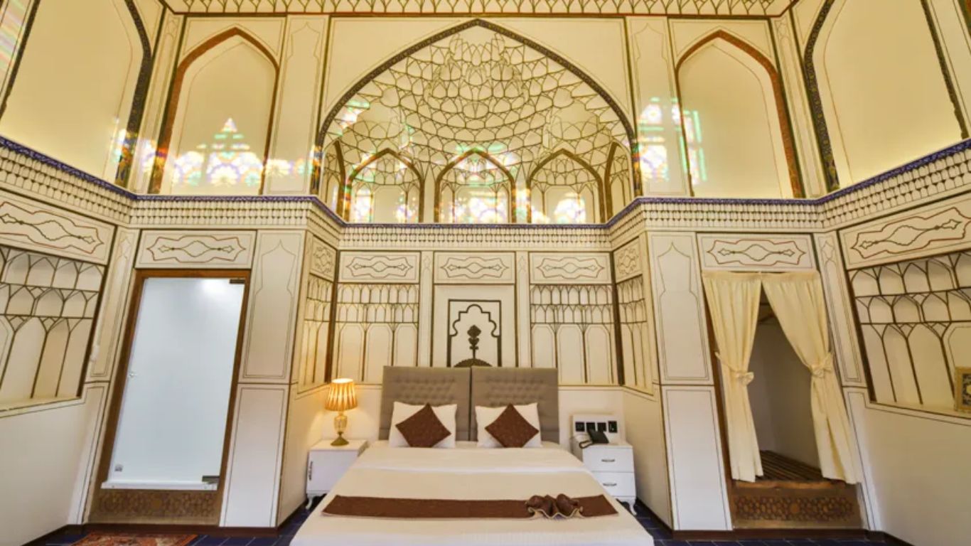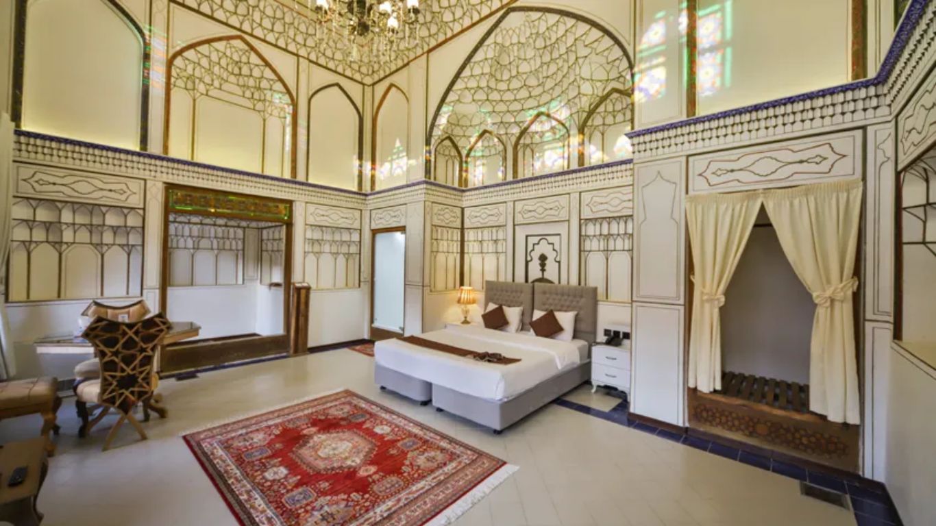 The Royal VIP category features two bright rooms with 6-meter high ceilings and one room showcasing the only open muqarnas design in the country. These rooms, reflecting the Qajar and Zand periods, include the Pool House, West Hall, and East Hall. Guests in these rooms enjoy breakfast, afternoon tea, and complimentary airport transfers.
