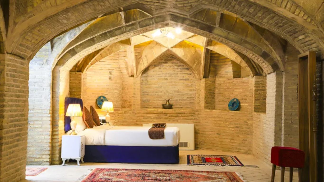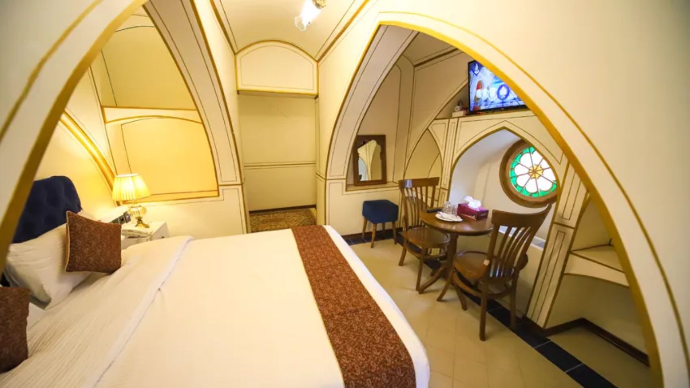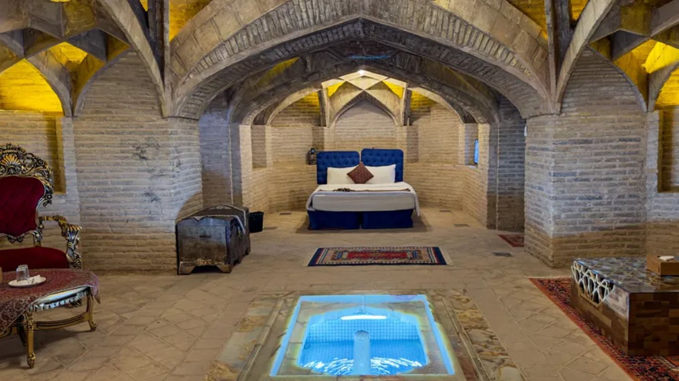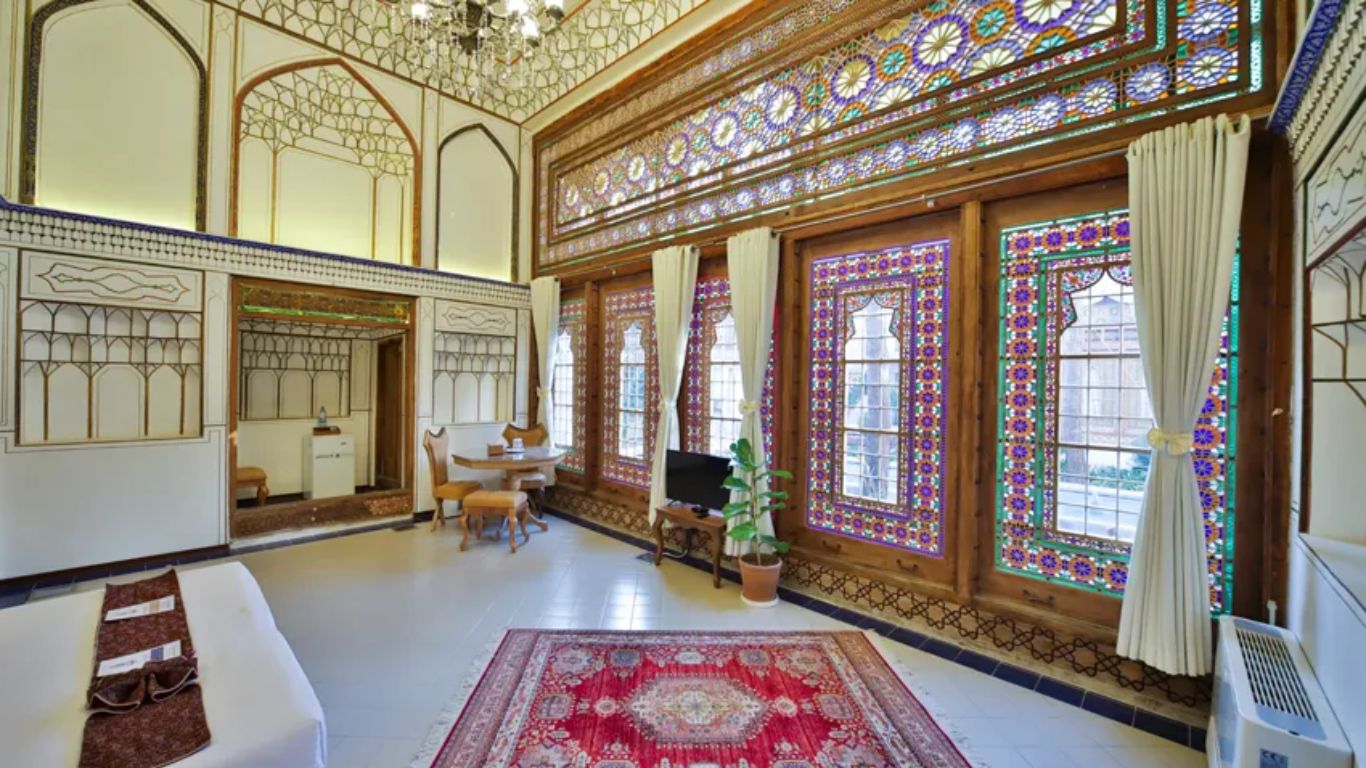 The boutique hotel features 20 master rooms with unique interior designs, categorized into Bronze, Silver, Gold, VIP, and Royal VIP levels, accommodating up to 50 guests. Each room is equipped with a private bathroom, modern amenities, and cooling and heating systems. The hotel also has a royal lounge area, formerly used for public gatherings, now restored for guest use. This magnificent space, dating back to the Zand era, features some of the finest wooden craftsmanship in Iran. Additionally, the hotel provides private parking for guests.